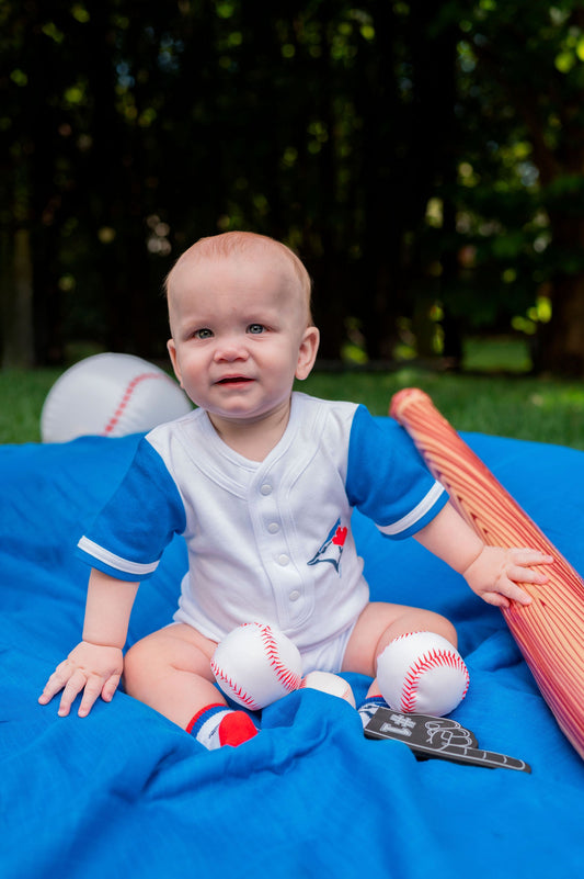 Welcome your little ones to the fan club with this MLB Baby Romper! Our colorful onesie will add team spirit to your infant's style, while snug snap closures keep them comfy and safe. Crafted with 100% cotton and official team insignia, it's the ideal way for your littles ones to show their Blue Jays pride! Authentic licensed MLB merchandise - check out the Gertex shop for more licensed sport apparel and accessories! Go team!