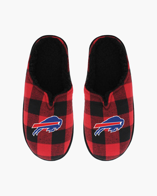 - Crafted with a classic red and black buffalo plaid design, these slippers boast team spirit with every step. The open back style ensures easy slip-on and off, while the cozy sherpa lining provides warmth and comfort during those chilly game nights.